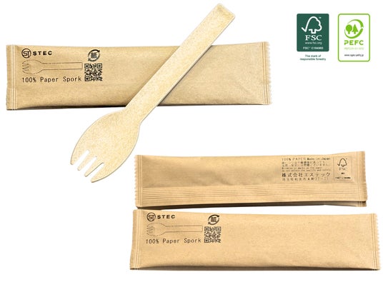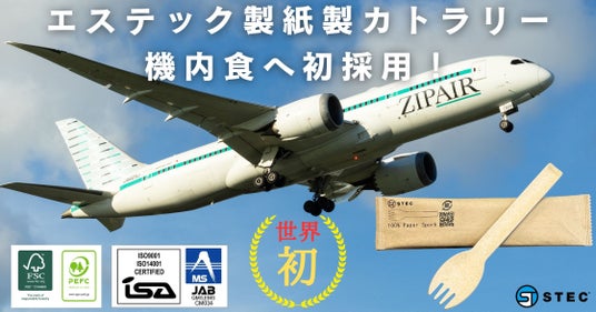 株式会社エステック(本社:埼玉県和光市、代表取締役:坂本 学)は、このたびFSC認証紙使用で、自社開発製品の「100%紙製スフォーク(先割れスプーン)」を、株式会社ZIPAIR Tokyo(本社:千葉県成田市)が運航する機内食サービスに採用されたことをお知らせいたします。FSC認証紙100%紙製スフォークが航空機内で本格導入されるのは、世界でも初めての事例となります。