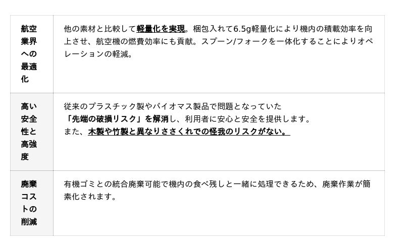 ※1 当社調べ(2025年6月時点)。主要航空会社(国内外30社以上)の過去の機内食用カトラリーに関する公開情報、業界紙、特許情報、企業発表をもとに独自に調査。完全に紙素材のみで構成されたスプーン・フォーク一体型カトラリー(スフォーク)の航空機機内食採用は、当社確認の限り世界初。