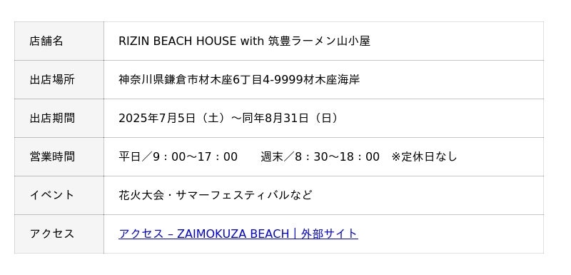 『九州筑豊ラーメン』ブランドのチェーン展開や食材の卸売りをおこなうワイエスフード株式会社(本社:福岡県田川郡香春町鏡山552-8/代表取締役社長 高田 十光 以下、当社)は、7月5日(土)より材木座海岸(神奈川・鎌倉市)の海の家「RIZIN BEACH HOUSE」と期間限定でコラボいたします。