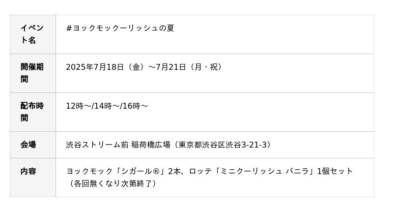 株式会社ヨックモック(本社:東京都千代田区/代表取締役社長:藤縄武士)は、株式会社ロッテの「クーリッシュ」とのコラボレーションによる期間限定イベント「#ヨックモックーリッシュの夏」を、2025年7月18日(金)~21日(月・祝)の4日間限定で、渋谷ストリーム前稲荷橋広場にて開催します。シガールの夏の新しい食べ方提案として話題になった“#ヨックモックーリッシュ”を楽しめる無料サンプリングを実施。また、会場には昨年ご好評いただいたサンプリングトラック「BLUE GIFT TRUCK」が今年も登場。 SNSでも話題となった夢の共演を、リアルな体験としてお届けする初の試みです。