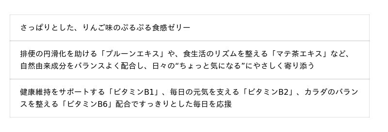 簡単に美味しく摂取できるディーフィットゼリーは、プルーンエキスやマテ茶エキスなど植物由来成分をはじめ、ビタミンB群(※8)もバランスよく含み、毎日の“ちょっと気になる”に寄り添うアイテムです。