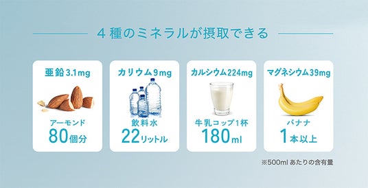 販売先 :公式ECサイトにて販売原材料名:水/炭酸、乳酸Ca、塩化Mg、グルコン酸亜鉛、塩化K