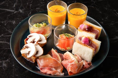 黄金に輝く「ゴールデンアフタヌーンティー」は、贅沢な味覚と優雅さを体験できる特別なひとときをご提供します。上段には、スミスティーメーカーのチャイとロクメイコーヒー/タカムラコーヒー*のブレンドを使用した二層仕立てのジュレ、糖度の高い紅はるかを使用した蜜芋ブリュレ、そしてイチジクとフロマージュブランを繊細にグラサージュしたケーキなど、まさに黄金の輝きにふさわしい豪華なガトー5種が並びます。下段には、栗とシャンピニオンの深い旨味が詰まったキッシュや、旬のイチジクを贅沢に使用した生ハムとモッツァレラのコンビネーションなど、秋の恵みを彩るセイボリーが揃います。ガトーを引き立てる、トリュフマヨで味わうフライドポテトも大人気の一品です。