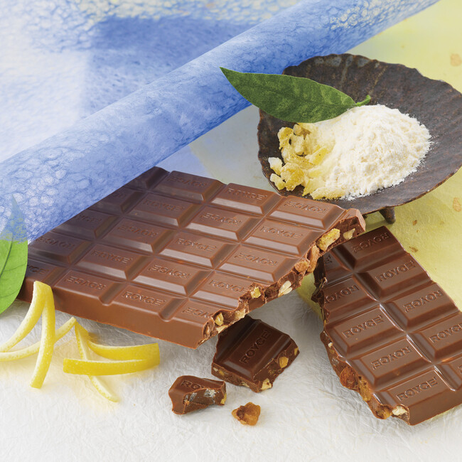 京都府水尾のゆずを使ったピール、まろやかで上品な甘さの和三盆でつくったサクサク食感のトフィー(※)、そして砕いたアーモンドをチョコレートに散りばめました。