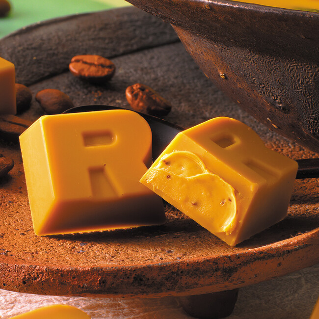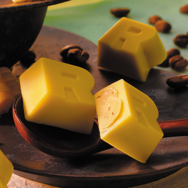 北海道のとうもろこし・かぼちゃのチョコレートとクリームに、京都 小川珈琲の香り高いコーヒーを合わせた、R型のショコラ。コクのある甘みのポタージュに、コーヒーのほろ苦さをプラスしたイメージでつくりました。それぞれ中のクリームには小川珈琲の中細挽きコーヒーとクッキークランチをプラスし、味わいと食感にアクセントをつけています。[とうもろこし]・[かぼちゃ]の2種をセットにしました。