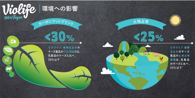 当社が日本国内で販売している「Violife」植物生まれのチーズ既存4商品について、生産から廃棄までのライフサイクルにおけるCO2排出量が、日本国内で販売されている乳製品のチーズの30%以下に、土地占有面積も25%以下に抑えられていることが判明しました※2。主な理由は、この商品がココナッツオイルなどの植物を主原料としており、乳牛を生育する工程が不要であることに由来しています。