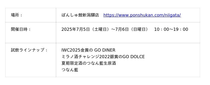 津南醸造株式会社(本社:新潟県中魚沼郡津南町、代表取締役:鈴木健吾、以下「津南醸造」)は、2025年7月5日(土)・6日(日)の2日間、ぽんしゅ館新潟驛店にて日本酒の試飲イベントを開催いたします。時間は両日とも10:00~19:00を予定しており、豪雪地・津南の自然が育んだ日本酒の魅力をお楽しみいただけます。