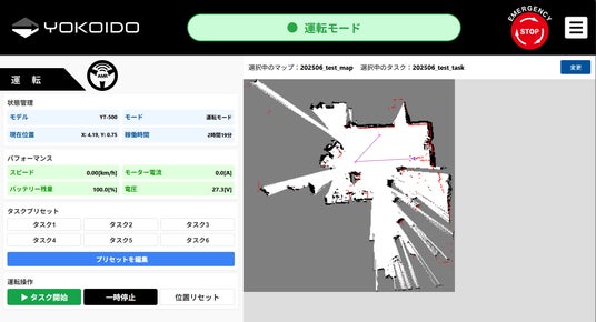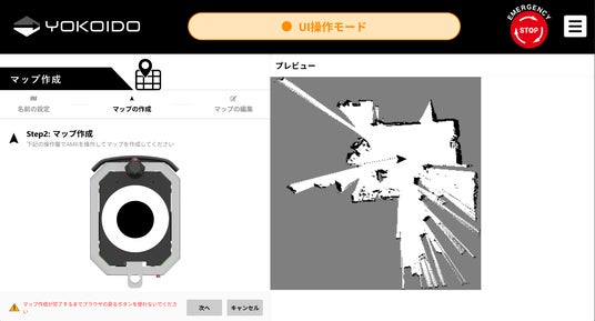 「YOKOIDO簡単UI」(以下、「本UI」という)は、<誰でも簡単に使えること>をコンセプトに設計されており、産業用としての機能はそのままに、専門知識がない現場スタッフでもAMRを直感的に操作・設定できます。ソフトウェアのインストールは不要で、PCやタブレットのWEBブラウザからアクセスするだけで、地図の作成、走行ルートの設定、走行開始などすべての操作をスムーズに完了できるので、現場の端末を変更する時やアップデート時にも余計な手間がかかりません。