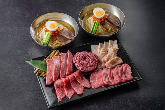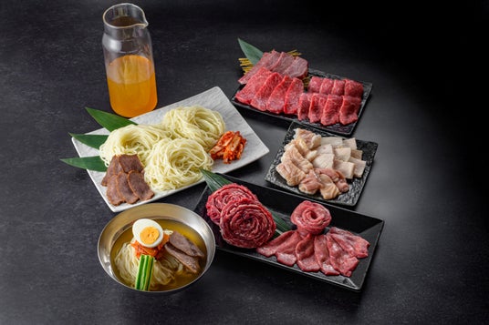 カップルやご夫婦での特別な食卓に。冷麺2食分に加え、 薄切りタン、厳選赤身、希少部位、一本ハラミ、ミックスホルモンの 人気5種類を合計510g(約2人前)セット。
