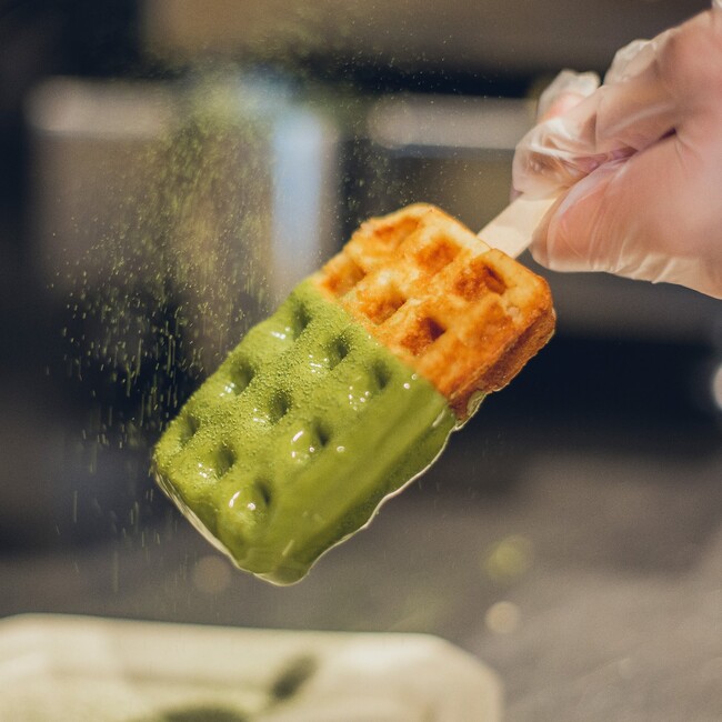 当店で使用する抹茶粉は全て京都の老舗抹茶店「山政 小山園」のお抹茶。京ワッフルに合う抹茶粉を厳選し、抹茶本来の香りとほろ苦さを存分に楽しんでいただけます。