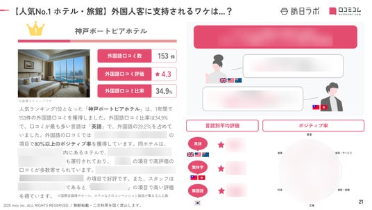 業界最大級のインバウンドビジネスメディア「訪日ラボ」及び 店舗向け集客一元化プラットフォーム「口コミコム」を運営する株式会社mov(代表取締役:渡邊 誠、本社:東京都渋谷区、以下mov)は、兵庫県のホテル・旅館に寄せられた最新の口コミデータから、独自の『インバウンド人気ホテル・旅館ランキング』を発表しました。