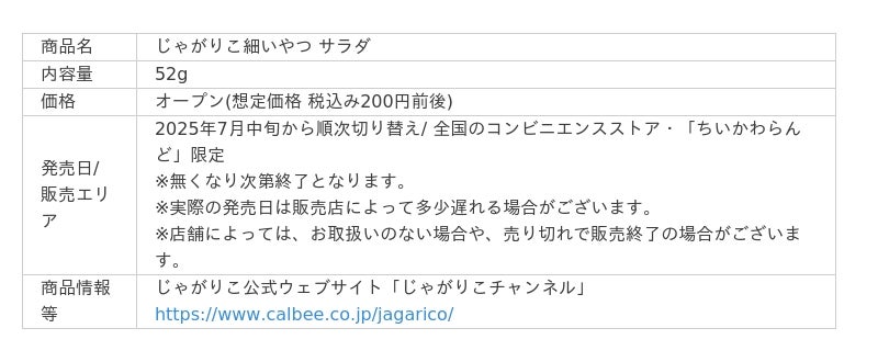 カルビー株式会社(本社:東京都千代田区、代表取締役社長兼CEO:江原 信)は、独自の製法で“はじめカリッとあとからサクサク”の心地よい食感が楽しめる「じゃがりこ」ブランドより、スティックの細さが特長の『じゃがりこ細いやつ サラダ』のパッケージを、人気キャラクター「ちいかわ」とコラボレーションしたパッケージに2025年7月中旬から順次切り替えて発売します。全国のコンビニエンスストアと「ちいかわらんど」限定で展開します。※数量限定、無くなり通常パッケージに戻ります。