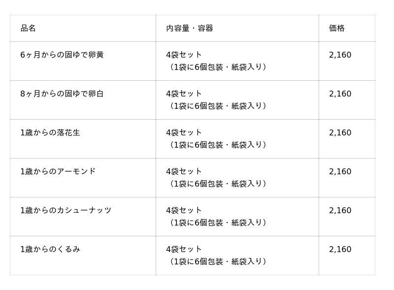 <単品食材の4袋セット> (単位:円 消費税込・送料別)
