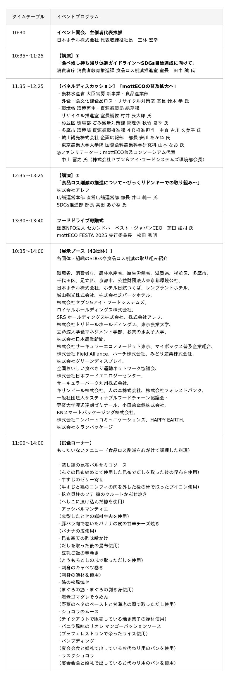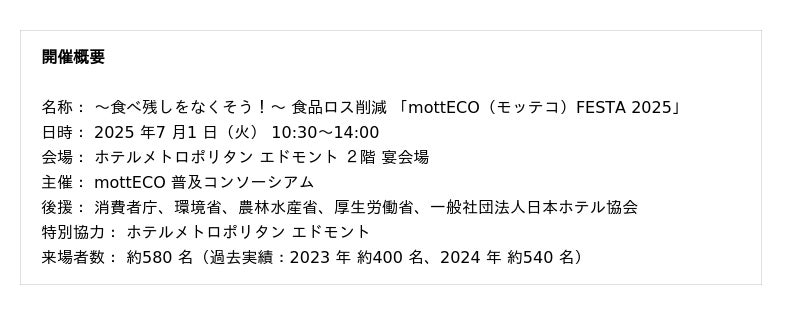 日本ホテル株式会社(豊島区西池袋 1-6-1、代表取締役社長 三林宏幸)が参加する産官学民アライアンス「mottECO普及コンソーシアム」は、2025年7月1日、ホテルメトロポリタン エドモントにて「mottECO FESTA 2025」イベントを開催しました。