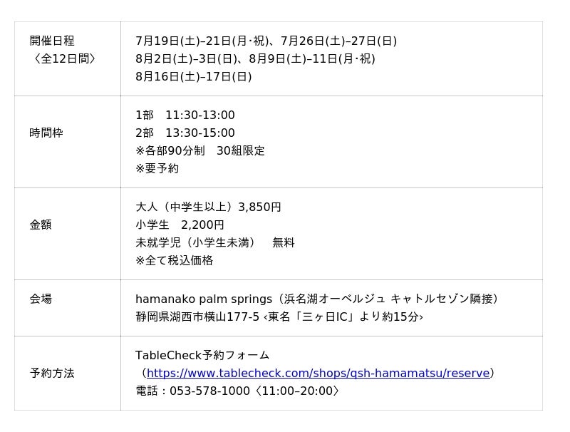 浜名湖オーベルジュ キャトルセゾン(静岡県湖西市)は、グランピング施設「hamanako palm springs」を舞台に、夏季限定イベント 「グランピングビュッフェ 2025」 を開催します。シェフ特製フルーツかき氷、三ヶ日牛ソーセージの豪快カスクルート、宿泊者限定メニューとして話題を集めた“幻のホワイトカレー”の三本立てで、アウトドア気分と本格フレンチの技を一度に楽しめるプレミアムビュッフェです。
