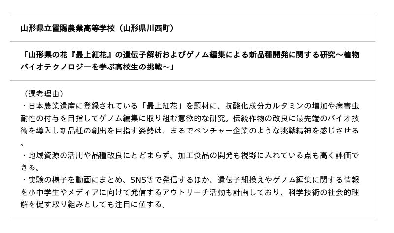 バイテク情報普及会(所在地:東京都中央区)は、高校生による「植物バイオテクノロジー」や「持続可能な農業」に関する科学教育活動を支援する「高校生科学教育大賞」の第9回受賞校を決定しました。最優秀賞には、日本農業遺産に登録されている「最上紅花」の遺伝子解析とゲノム編集による新品種開発に挑戦する山形県立置賜農業高等学校(山形県川西町)が選ばれました。同校には、申請額満額となる100万円の活動費を、バイテク情報普及会より支援いたします。
