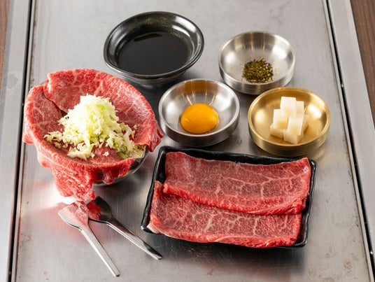 和牛を贅沢に使用する「和牛すき焼きもんじゃ」 ※写真中央の卵黄はトッピング(別途注文)です。
