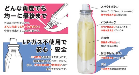 PET外装バッグオンバルブ(BoV)外装を従来の金属缶からPETに変えたことで、中身が見えるスプレーボトルです。これまでにない使用感で新たな顧客体験を提案できます。不燃性の窒素ガスで加圧するため、安心、安全。専用機械で再充填することも可能です。