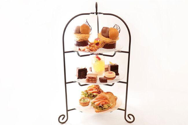 上段には季節のデセール「マロン ショコラ」、中段にはベルアメールで人気のチョコレートケーキ ショコラノワール、紅茶のショコラミルフィーユ、エルダーフラワーのタルト、りんごとチーズのベリーヌ、ボンボンショコラ、下段にはサンドイッチやミニキッシュを盛り合わせました。