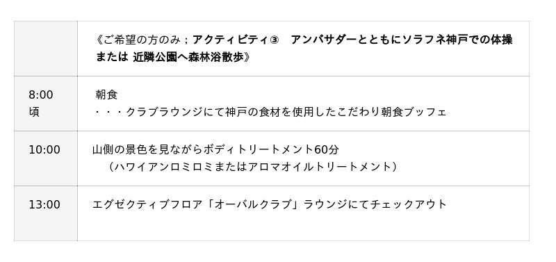 翌朝の朝食の前に、屋上テラス「ソラフネ神戸」での体操または近隣の公園に森林浴散歩へ、アンバサダーがご案内いたします。雨天・荒天の場合は、フィットネス施設内のスタジオで体操を行うことも可能です。