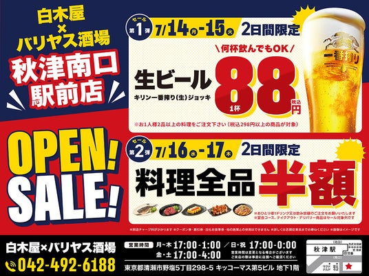 「白木屋×バリヤス酒場 秋津南口駅前店」では、オープンを記念したセールを開催いたします!