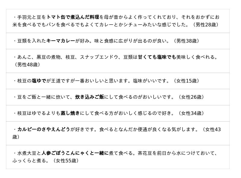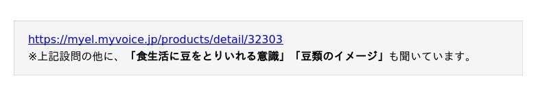 本調査の豆類は、豆を原料として加工した食品(納豆、豆腐、味噌など)は除きます。調査結果をお知らせいたします。