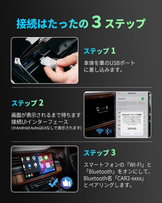 接続超簡単お使いの車両が有線CarPlay/Android Autoをサポートしていれば、挿すだけで接続が完了します。ナビに画面が表示された後、スマートフォンの「WI-FI」と「Bluetooth」をオンにして、Bluetooth名「CAR2-xxxx」とペアリングします。そして、ワイヤレスでカープレイ機能やAndroid Auto機能をお楽しめ頂けます。