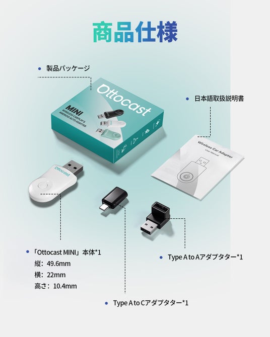 商品仕様このUワイヤレスカーアダプターはUSBメモリ見たいな小さいボディサイズのため、場所を取らず運転の邪魔になりません。また、Type A to AアダプターとType-C to Cアダプターが同梱されます。車の接続はタイプCな場合でも、USB変換して接続でき、心配はいらないです。