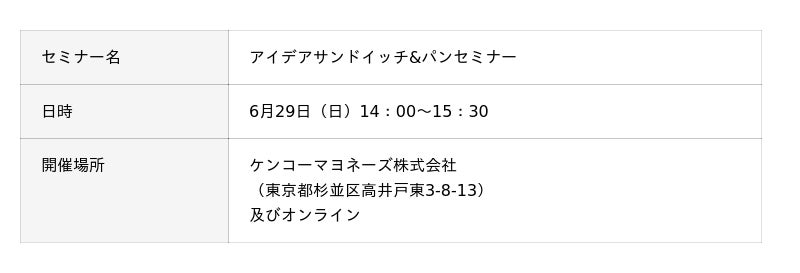 ケンコーマヨネーズ株式会社(本社:東京都杉並区、代表取締役社長:島本 国一、以下「当社」)は2025年6月29日(日)に、一般社団法人 日本パンコーディネーター協会(代表:稲垣 智子、以下「日本パンコーディネーター協会」)と共同で、当社東京本社とオンラインにて、ベーカリー従事者向けに『アイデアサンドイッチ&パンセミナー』と題したセミナーを開催しました。