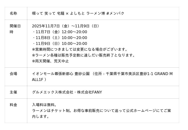 国内最大級のラーメン専門通販サイト「宅麺.com」を運営するグルメエックス株式会社(本社:東京都港区、代表取締役社長:冨澤 文秀)は、吉本興業グループの株式会社FANY(本社:東京都新宿区、代表取締役社長:梁 弘一)と共同で、ラーメンイベント「啜って 笑って 宅麺 × よしもと ラーメン博 #メンパク」を開催します。日本が世界に誇るトップコンテンツの「ラーメン」と「お笑い」がタッグを組んだ、おいしくて笑える3日間。本イベントでは、有名ラーメン店と人気芸人のコラボラーメンなど、全国から選りすぐった約30種類の名店のラーメン・つけ麺が集結します。さらに、人気芸人たちによるステージで会場を盛り上げます。美味しいラーメンとお笑いの力を通してご来場の皆さまに、心に残る時間を提供します。