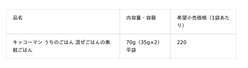 「うちのごはん 混ぜごはんの素」シリーズは、今回発売する「鮭ごはん」を入れて全7種類となります。「うちのごはん 混ぜごはんの素」シリーズを使えば、お弁当のバリエーションを簡単に増やすことができます。また、お茶碗1~2杯分ずつの小分けタイプなので、気分や好みに応じて、いくつかの種類を使い分けることもできます。