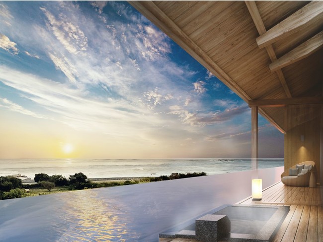 客室は海と空とが溶け合い、つながるインフィニティな空間、温泉露天風呂、ウッドデッキからは「璃庵」のランドマークでもある「水盤」が海との一体感をより際立ててくれます。