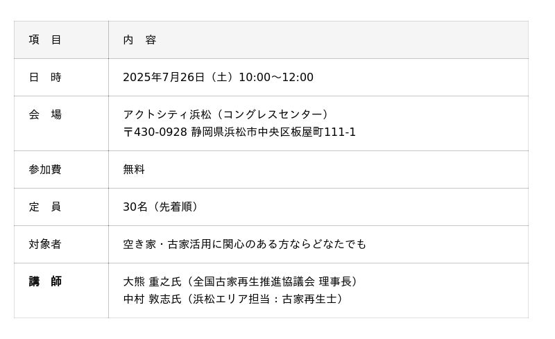 空き家数が全国で1,000万戸を超え、地域課題として深刻化する中、空き家を“負債”から“地域資産”へと転換する取り組みが注目されています。空き家再生を牽引してきた一般社団法人 全国古家再生推進協議会は、東海エリアでの多数の実績を踏まえ、浜松市では初となる無料セミナーを開催。理事長と第一線の再生士が、成功事例と具体的な収益モデルを公開し、30名限定で参加者を募集します。