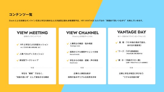 “見晴らしのよい地点=Vantage”をコンセプトに、企業の人事担当者が採用の悩みやリアルな知見を共有しながら、学生とフラットに交流できる、オンライン×オフラインの共創コミュニティです。