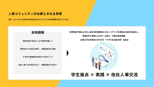 本取り組みでは、採用現場で積み上げた上場企業の実践知とスタートアップの柔軟な企画力を融合し、現場の声に根差した学び・出会い・共創の場を構築。これまでにない、企業と学生が相互に学び合う“リアルな対話の場”の創出を目指します。