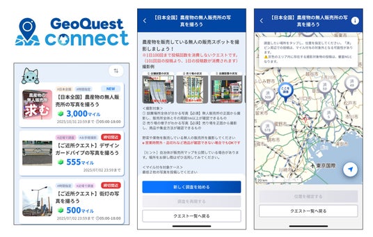 今回、ローンチから1年で3万DLを突破し、累計投稿枚数が200万枚にのぼる「ジオクエ」を活用し、ユーザーに向けて農産物の無人販売所の写真投稿を依頼する「クエスト」を出題することで、効率的に情報を収集し、これまで十分に整備されていなかった全国の無人販売所情報の見える化を実現します。なお、クエストの参加者には、調査協力のお礼としてマイルを付与し、貯まったマイルは現金や、各種ポイントに交換することが可能です(※1)。
