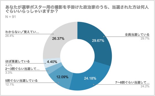 選挙ポスター撮影経験がある91名のカメラマンに、撮影した候補者がその後当選したか否かを聞くと、撮影した全員が当選したと回答したのが29.67%。7割以上の当選率を誇るカメラマンは53.85%で、約50名いることがわかりました。