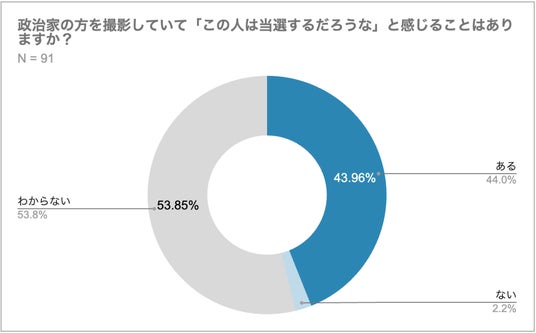 撮影する中で、「この候補者は当選するだろう」と感じることがあると回答したカメラマンは40人で撮影経験者の43.96%でした。さらに、その予感が的中しているカメラマンは34名で、85%が「当選の予感」が当たっていることがわかりました。