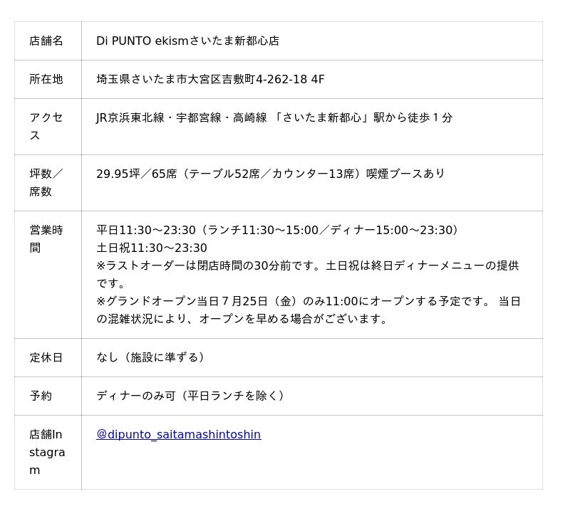 JR「さいたま新都心」駅3Fコンコース直結の複合施設「ekismさいたま新都心」(2025年7月25日開業)の4Fに『Di PUNTO ekismさいたま新都心店』をオープンします。店舗の内装は、木を基調とした自然で温かみのあるデザインで、まるで友人宅に招かれたような気軽でリラックスできる雰囲気を演出しています。