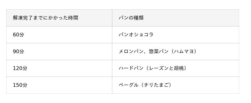 方法:冷凍保存していたパンを常温(26℃)に置き、30分ごとに中心部の温度を計測。中心温度が20℃を超えた時点で解凍完了と判断。