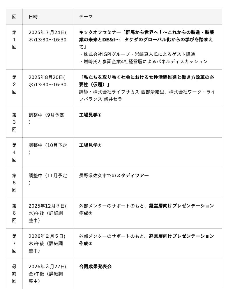 初回となる第1回は、キックオフセミナーとして、武田薬品工業株式会社・元代表取締役日本管掌/株式会社IGPIグループ シニア・エグゼクティブ・フェロー 岩崎真人氏に登壇いただき、「群馬から世界へ!~これからの製造・製薬業の未来とDE&I」をテーマに講話いただいたのち、4社の経営陣とのパネルディスカッションを行います。