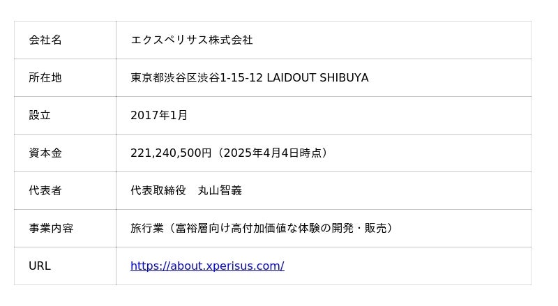 エクスペリサス社は、数多くの高付加価値体験を開発し、世界中の富裕層に向けて日本の体験ツアーを企画・販売しているスタートアップ企業で、これまでに、官公庁、自治体、民間企業と連携しながら独自のツアーを企画・販売をしてきました。このたびの資金調達を機に、海外マーケティングの強化、人材およびITへの投資促進、経営体制の強化を図ることで、さらなる事業拡大と競争力向上を目指しています。