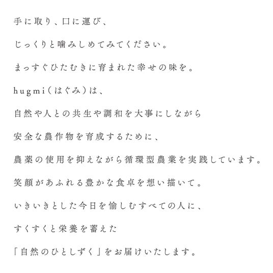 hug(抱きしめる)+育み(はぐくみ)から生まれた造語。食べる人の心まで届くように、自然の恵みをぎゅっと詰め込んだ農産物を、自分たちの手で届けたいという想いを込めています。