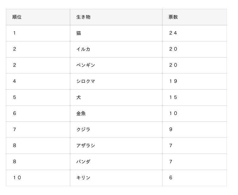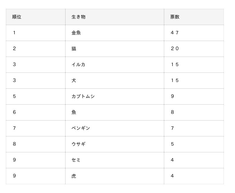金魚が最も多く挙げられた一方で、猫や犬、イルカなど親しみやすい動物も上位に入りました。