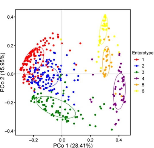 図2:腸内細菌叢の分類(1-3:ビフィズス菌優勢な菌叢、4-6:ビフィズス菌非優勢な菌叢)