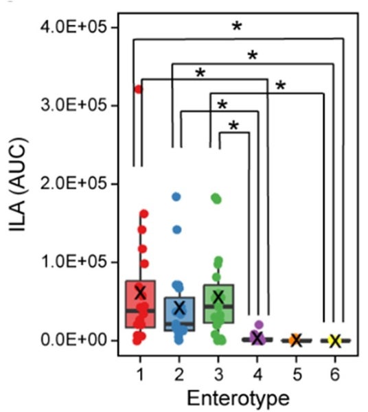 ・ビフィズス菌M-63摂取群では、ビフィズス菌優勢なタイプ(タイプ1-3)の分布が多く、このグループの腸内では抗炎症作用を有する代謝産物、インドール-3-乳酸(ILA)が増加していました(図3)。
