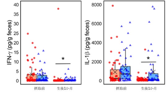 ・ビフィズス菌M-63摂取群では、生後1ヶ月時点の腸内で、インターフェロンγ(IFN-γ)とインターロイキン1β(IL-1β)などの炎症誘発性サイトカインの減少が観察されました(図1)。
