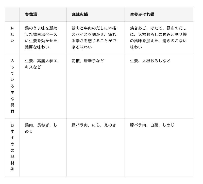 左から「参鶏湯(サムゲタン)」「麻辣火鍋」「生姜みぞれ鍋」