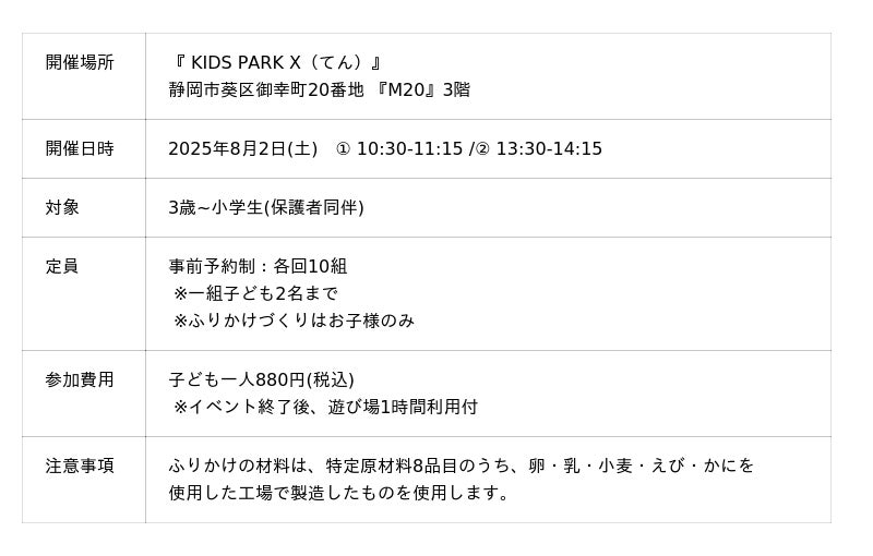 ニチフリ食品株式会社は、静岡駅北口エリアの複合ビル『M20』内の子ども向け屋内型遊び場施設『 KIDS PARK X(てん)』(運営:株式会社cosa)にて、夏休みの特別イベントとしてオリジナルふりかけを作る体験型ワークショップを開催します。対象は3歳から小学6年生とし、ふりかけができるまでを学びながら自分だけのふりかけを作るイベントです。