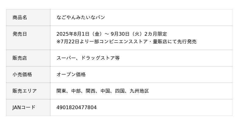 敷島製パン株式会社(Pasco)は、名古屋銘菓「なごやん」をイメージした「なごやんみたいなパン」を、2025年8月1日(金)~9月30日(火)までの2カ月間限定で関東、中部、関西、中国、四国、九州地区にて発売します。(*)